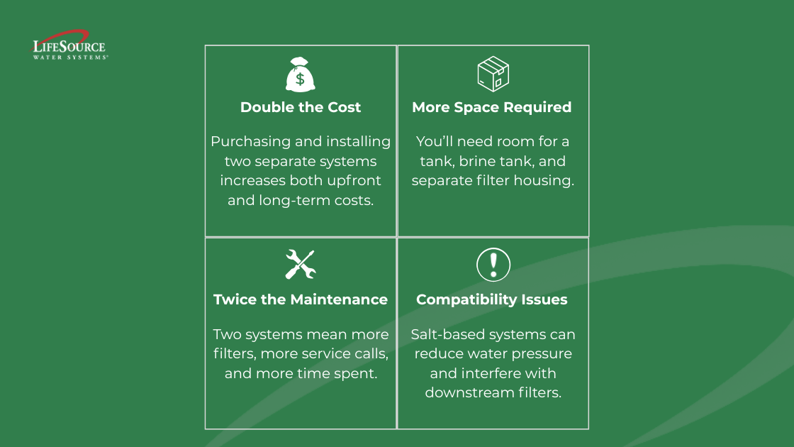 It’s also harder to troubleshoot when issues arise. Are you dealing with the softener? The filter? Both?